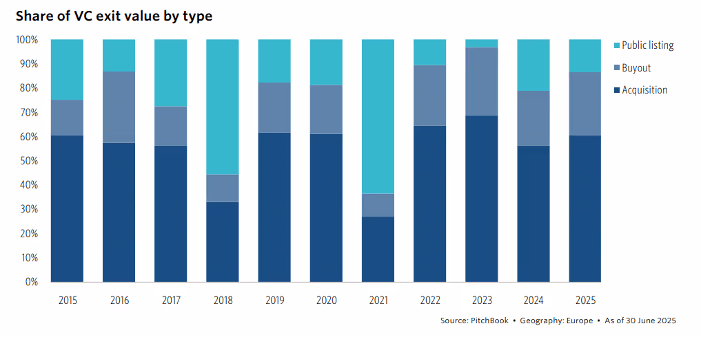 Na een herstel in 2024 zijn de exits in de eerste helft van 2025 opnieuw vertraagd. Met €26,8 miljard ligt de exitwaarde 12,3% lager dan vorig jaar. Overnames blijven de dominante weg, die meer dan 70% van het volume vertegenwoordigen, met opmerkelijke deals, waaronder EsoBiotec (€942 miljoen) en Brightflag (€425 miljoen). De zeldzame grote beursgang was de beursnotering van eToro ter waarde van €3,5 miljard in Israël.